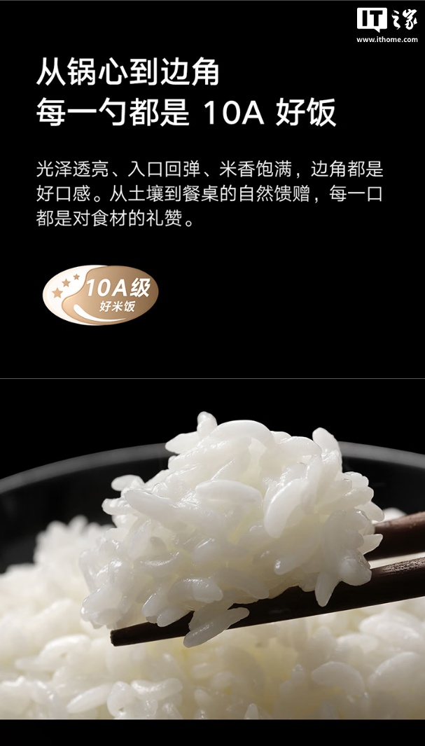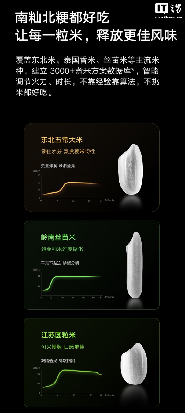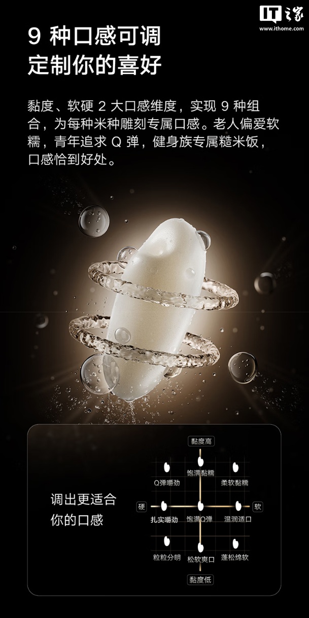 小米还针对东北米、泰国香米、丝苗米等主流米种建立了 3000 + 煮米方案数据库,智能调节火力、时长,号称“不挑米都好吃”;电饭煲还针对粘度、软硬两大口感维度,自定义 9 种口感,覆盖不同人群的口感偏好。