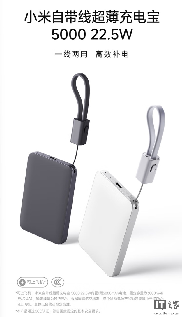 IT之家 9 月 8 日消息,小米自带线超薄充电宝 5000 22.5W 今日在京东等平台开售,价格为 149 元。