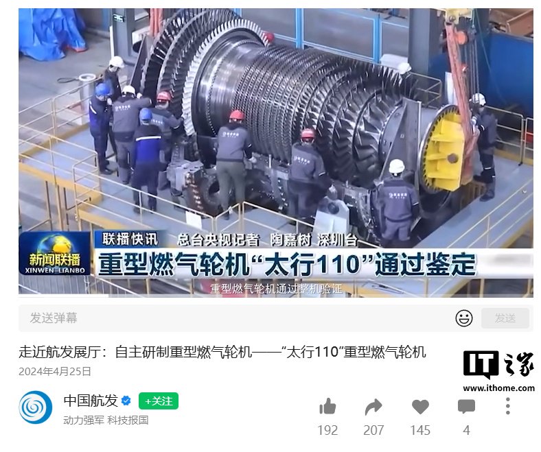 IT之家从中国航空发动机集团有限公司(中国航发)官方介绍获悉,“太行 110”重型燃气轮机是中国航发自主研制的具有完全自主知识产权的 110 兆瓦重型燃气轮机,具有启动迅速、综合热效率高、维护简便等优点,可使用燃油、天然气及中低热值气等多种燃料发电,可应用于热电联产、天然气调峰电站、联合循环发电等多个领域,还可配合风电、光伏、水电等多种能源耦合供电。