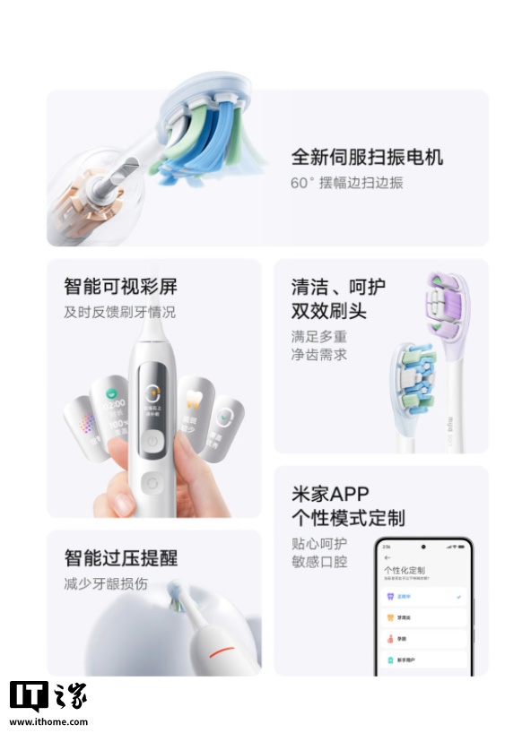 据介绍,这款牙刷配备全新伺服扫振电机,号称可以实现 60 度摆幅边扫边振,能够模拟巴式刷牙摆动原理,同时配合六轴陀螺仪可智能识别齿面。