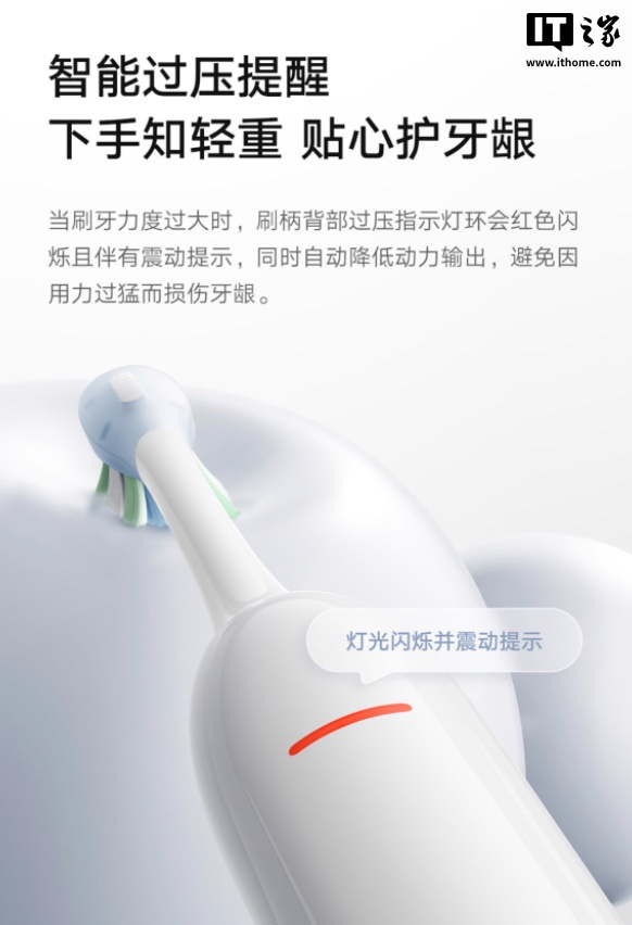 其他方面,该牙刷配备智能 LCD 彩屏,可以实施反馈齿面清洁状况,展示刷牙时长和牙齿菌斑情况。同时当刷牙力度过大时,刷柄背部指示灯会红色闪烁并伴有振动提醒,避免损伤牙龈。牙刷至高提供 180 天续航。