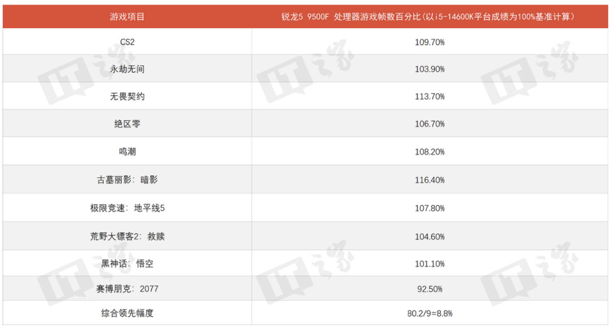 锐龙 5 9500F 相比酷睿 i5-14600K 性能高了约 8.2%,1% Low 帧高出约 11.6%。