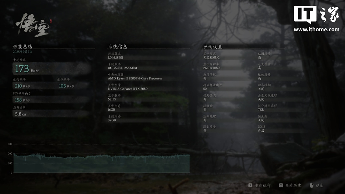在“众生平等”的《黑神话:悟空》中,以 1080P 分辨率 + 全高画质 + 50% TSR,运行游戏自带基准测试: