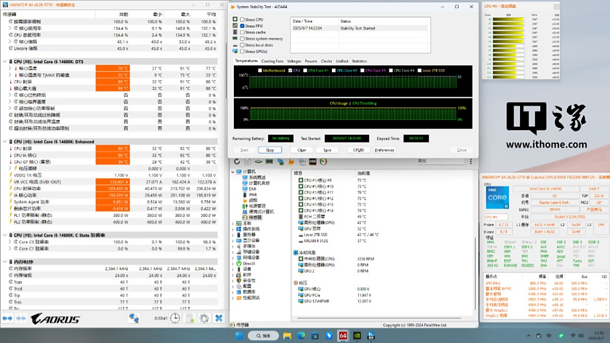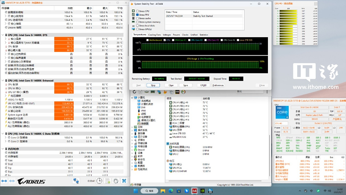 然后我们看看酷睿 i5-14600K 处理器的表现,同样烤机 30 分钟,CPU 功耗保持在 210W,整整高出锐龙 5 9500F 一倍还多。同时温度方面,酷睿 i5-14600K 的 CPU 温度保持在 89℃,高出锐龙 5 9500F 处理器 18°C。至于 CPU 频率方面,酷睿 i5-14600K 的 P 核频率更高,可以跑到 5.1GHz,E 核频率也有 3.9GHz。