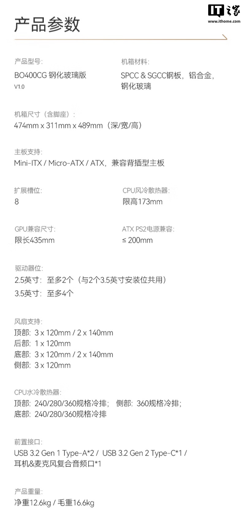 BO400 CG 的其它硬件规格与 BO400 无过多差异,其整体尺寸为 474mm x 311mm x 489mm,重量约为 12.6kg,支持 Mini-ITX、Micro-ATX 和 ATX 规格的主板,支持背插。