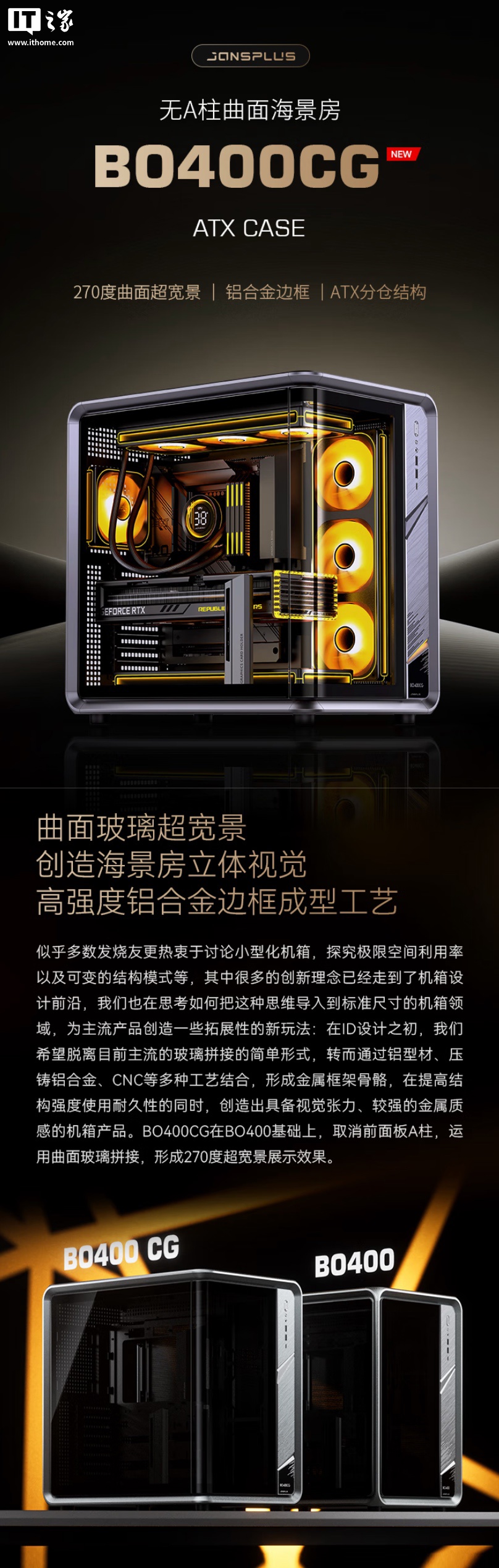 IT之家 9 月 8 日消息,乔思伯 BO400 机箱的衍生型号 BO400 CG 现已在京东开启预约,定价为 1599 元,相对于原版 BO400 机箱,这一改款的最大不同就是取消了左前立柱,前板的玻璃在左侧弯折延伸至左侧,形成两片式曲面弯玻“全景海景房”视觉效果。