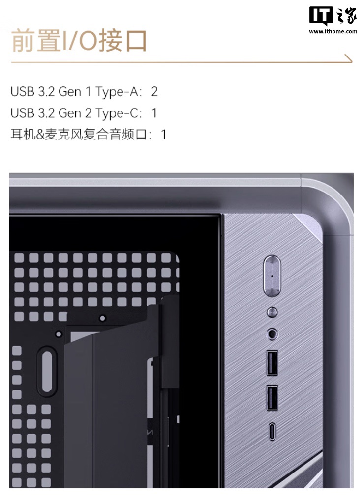 I/O 方面,该机拥有一个 USB-C 3.2 Gen2 接口、两个 USB-A 3.2 Gen1 接口、以及音频和麦克风插孔。
