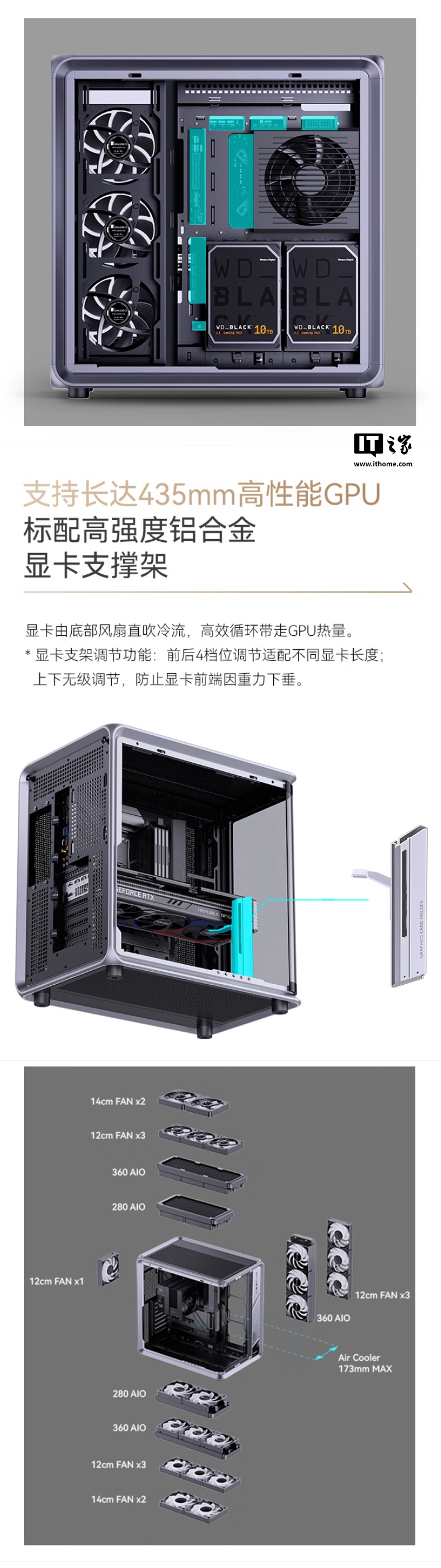 该机箱提供了最多 4 个 3.5 英寸或者最多 2 个 2.5 英寸硬盘位(与 2 个 3.5 英寸安装位共用);有 8 个全高 PCI 扩展槽;CPU 散热器限高 173mm;显卡限长 435mm,标配高强度铝合金显卡支撑架;支持 ATX 电源,限长 200mm。