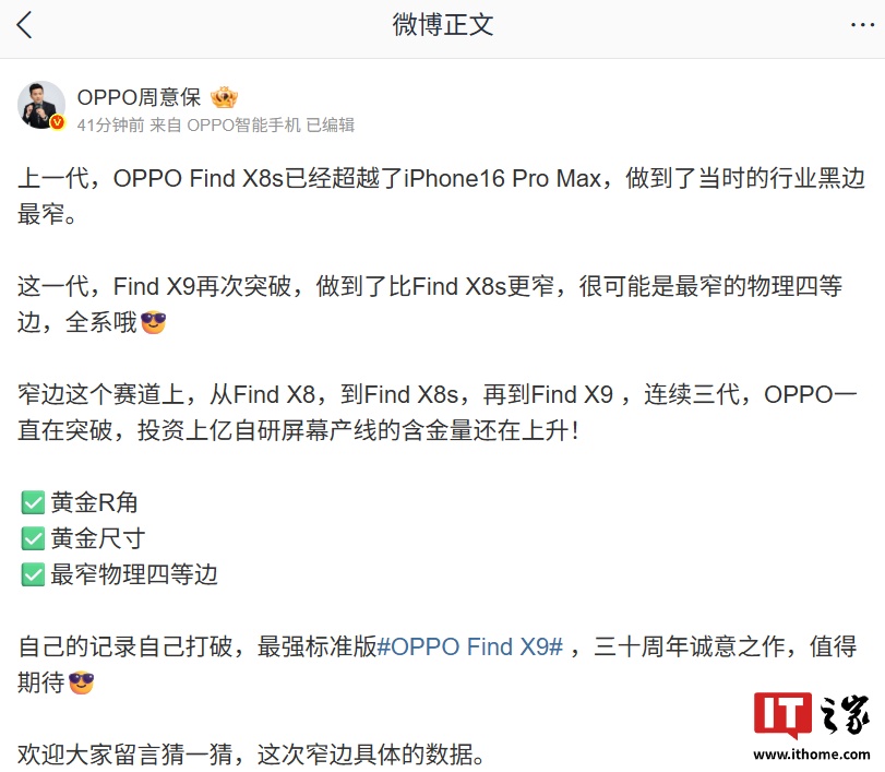 IT之家 9 月 9 日消息,OPPO Find 系列产品负责人周意保今日在微博“爆料”,称 OPPO Find X8s 已经超越了 iPhone16 Pro Max,做到了当时的行业黑边最窄。这一代 Find X9 再次突破,做到了比 Find X8s 更窄,很可能是最窄的物理四等边。
