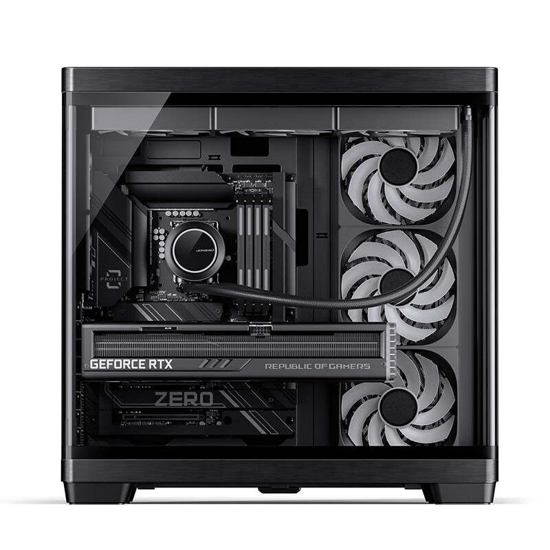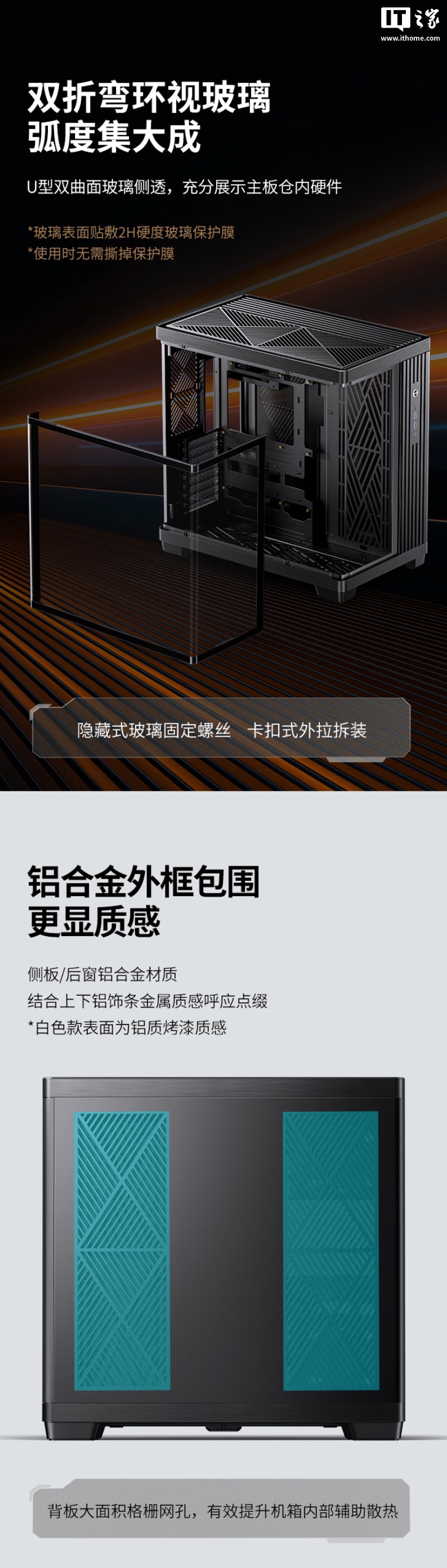 该机箱整体尺寸为 495×298.6×495 毫米,整体使用左右分仓布局设计,前方左侧和左方采用一块双折弯钢化玻璃。材质方面选用 1.0mm 的 SGCC 钢板和 4mm 玻璃,侧板、后窗、上下饰条则为铝合金材质。