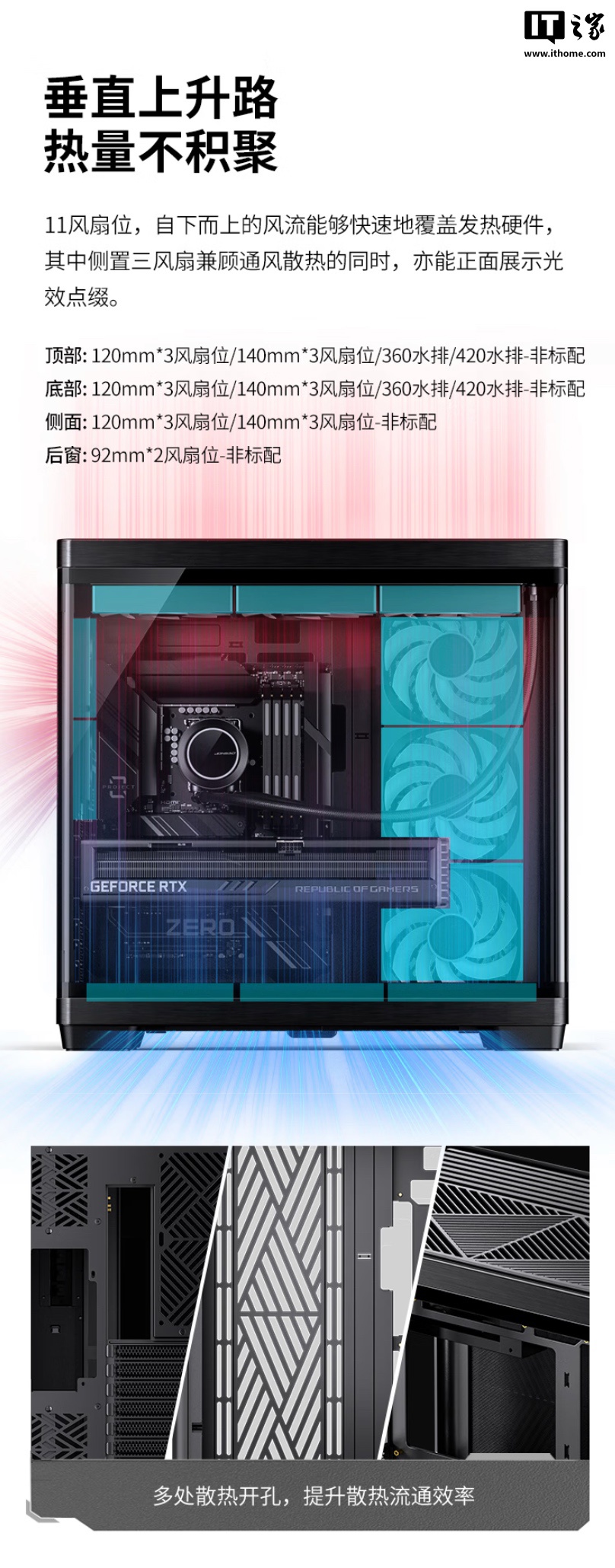 该机箱至多可安装 11 把风扇,其中顶部位置可安装三把 120mm /140mm 风扇,支持 360/420 冷排;底部位置可安装三把 120mm /140mm 风扇,同样支持 360/420 冷排;侧面位置可安装三把 120mm / 140mm 风扇;后置位置可安装两把 92mm 风扇。