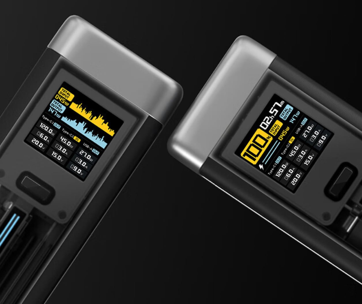 机身配备 1.54 英寸 TFT 彩屏,可实时显示剩余电量百分比、充放电剩余时间、输入 / 输出总功率、单口输入 / 输出等充电数据。