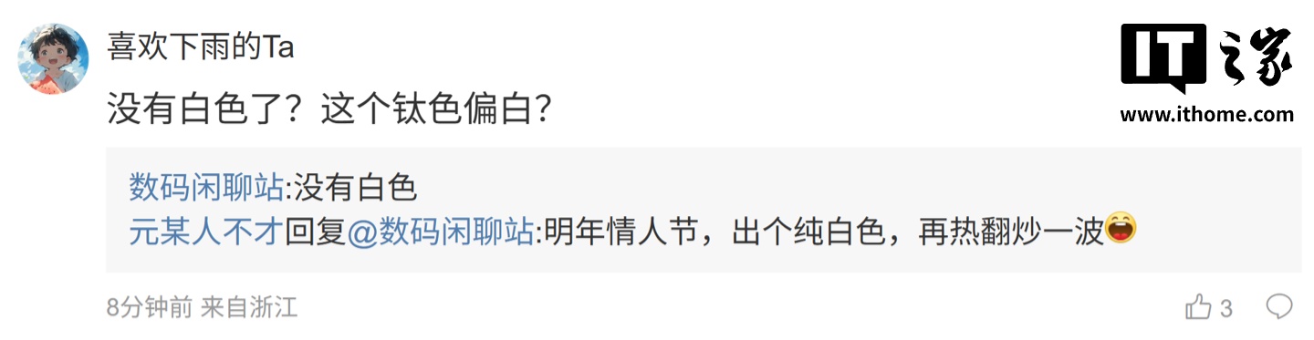 后续有用户在评论区询问:“没有白色了?这个钛色偏白?”,博主回复道:“