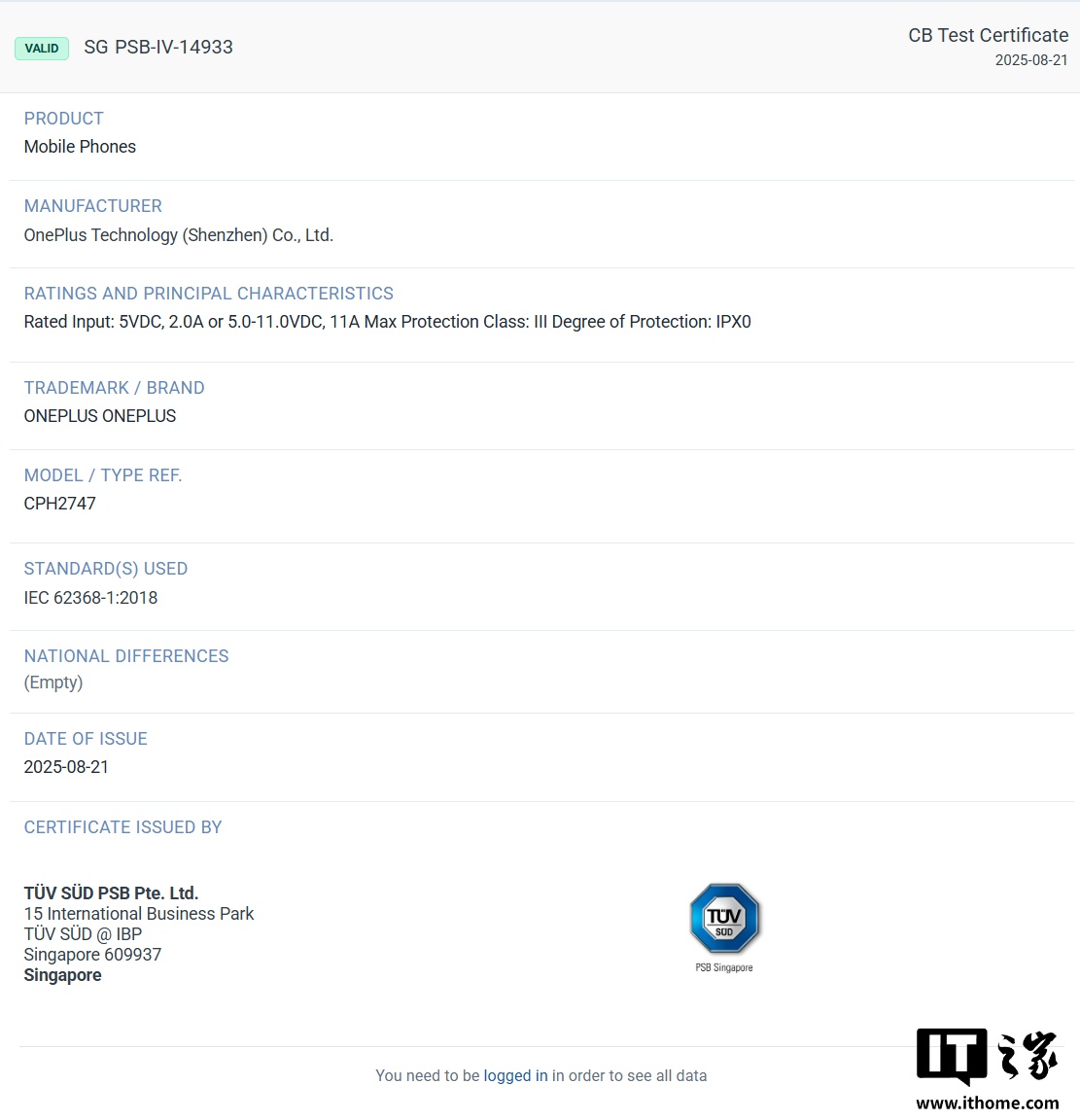 本月初(9 月 2 日),一款型号为 CPH2747 的一加新手机现身德国 TÜV 认证数据库,支持 5V DC / 2.0A、5.0-11.0V DC / 11A Max 输入,根据 11V DC*11A 可推算这款手机最高支持 121W 快充。