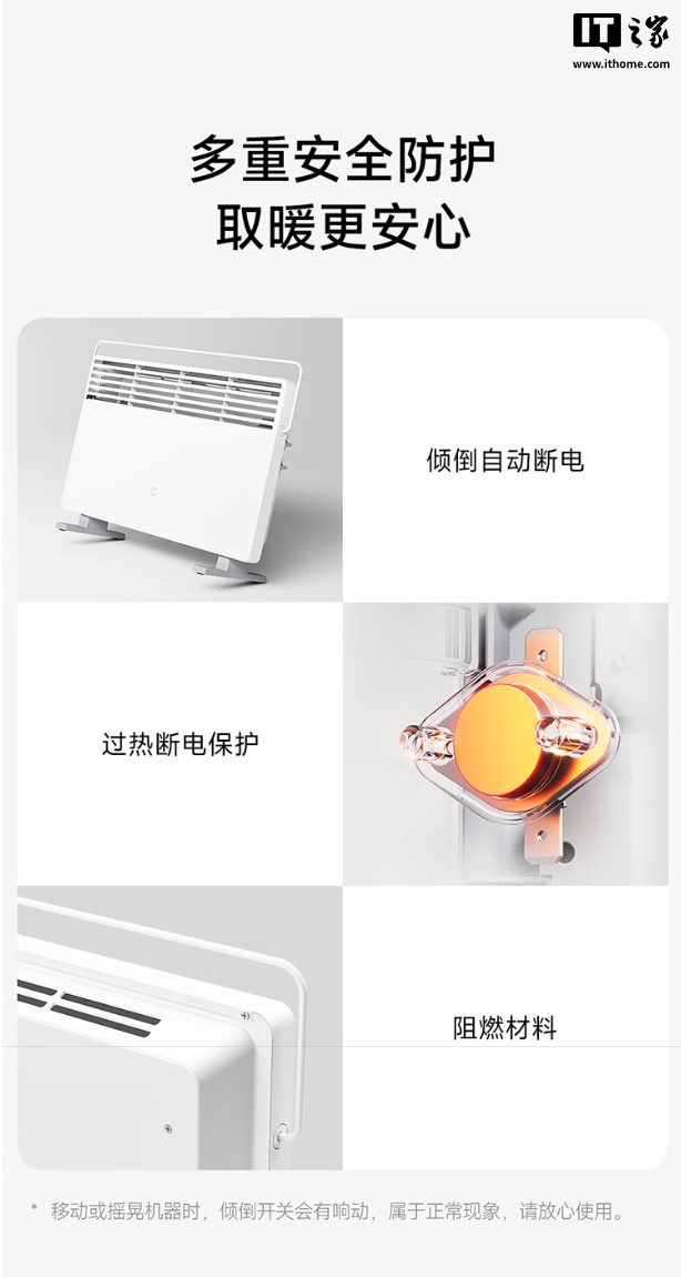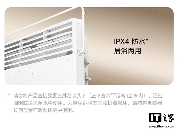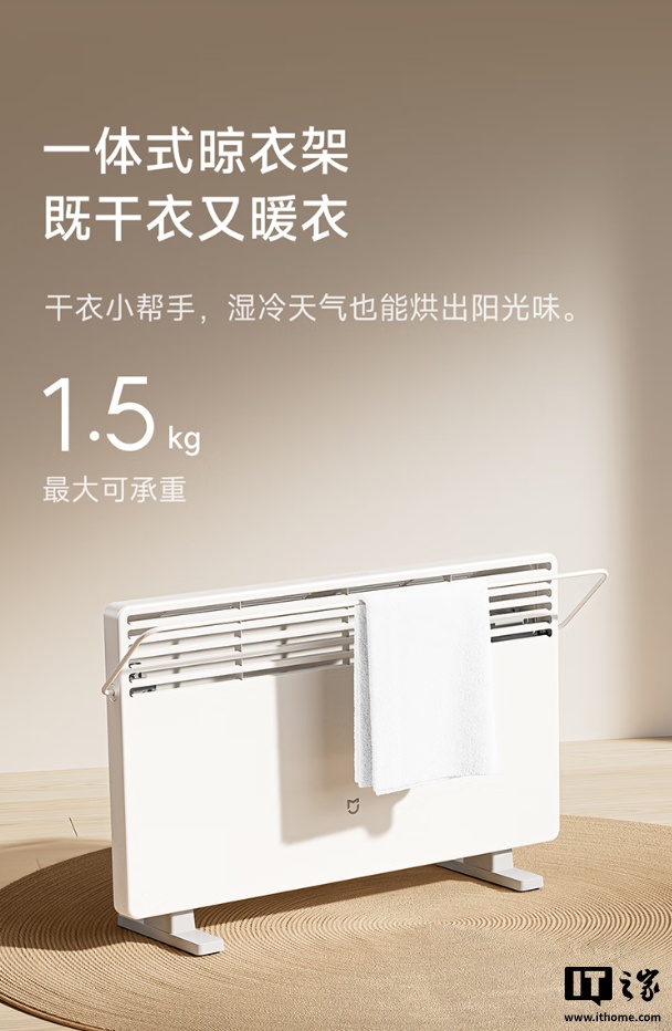 此外,这款电暖器还内置有一体式晾衣架,最大承重可达 1.5kg,机身支持 IPX4 防水,可在淋浴等场景使用,机身拥有倾倒自动断电、过热保护等安全功能。