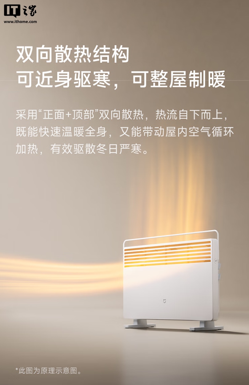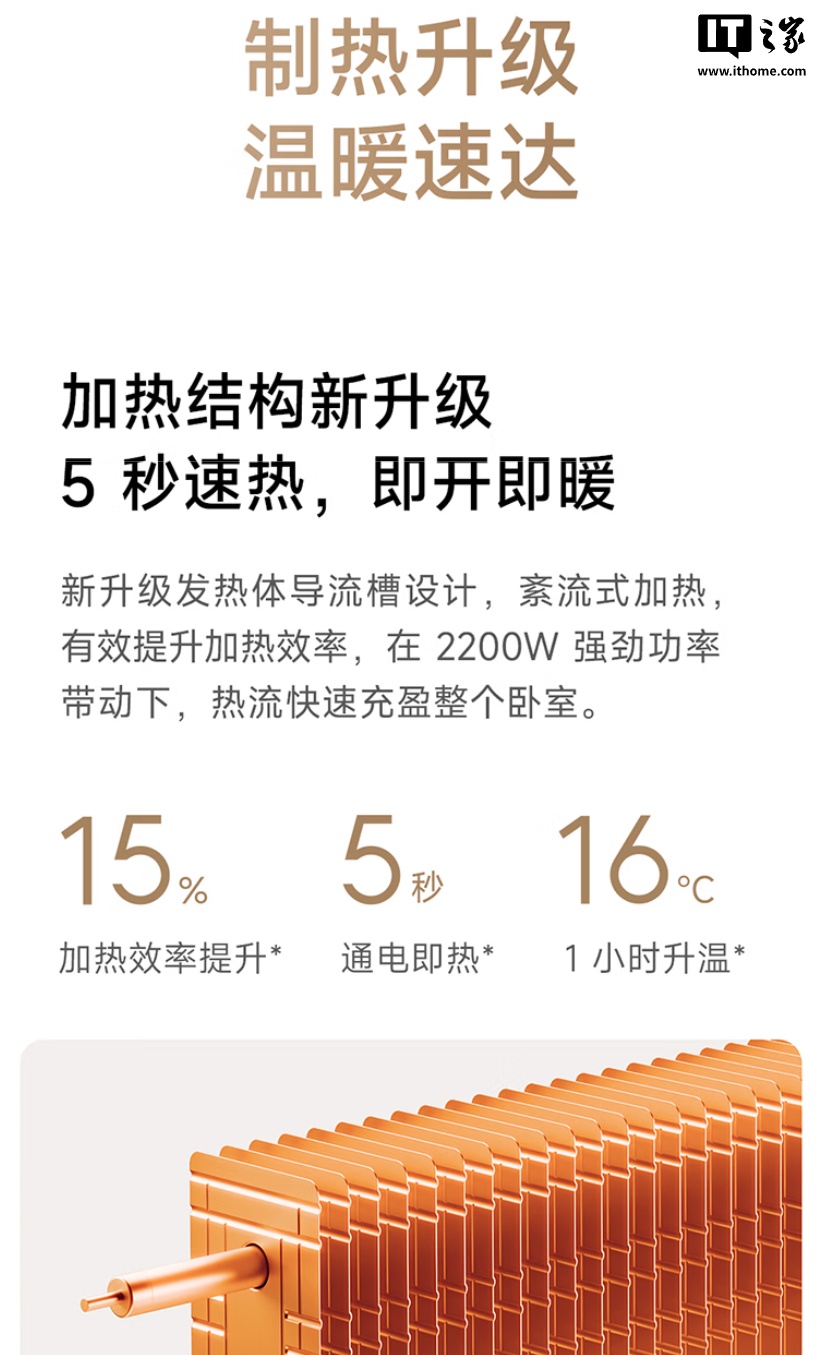 据小米介绍,这款电暖器升级了内部的发热体导热流槽,可实现紊流式加热,配合 2200W 的加热功率可实现 5 秒通电即热、1 小时升温 16°C,相比初代产品效率提升 15%。电暖器本体还采用正面 + 顶部双向散热设计,可让热流自下而上,带动屋内空气循环加热。