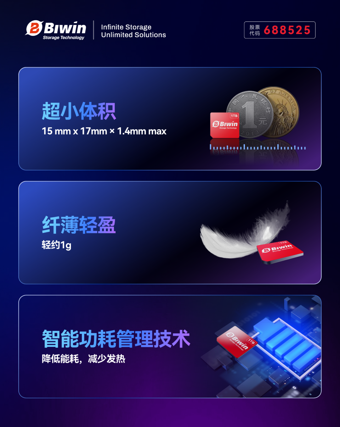 佰维 Mini SSD 通过 LGA 封装工艺,尺寸 15 x 17 x 1.4mm,体积仅为传统 M.2 2230 SSD 的 40%,重量仅为 1 克(约为一枚回形针)。