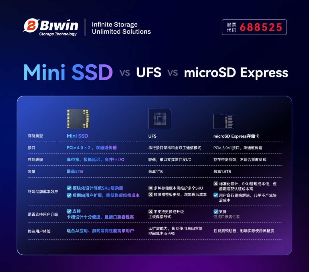 佰维 Mini SSD 提供 512GB、1TB、2TB 版本可选。其中,512GB 版本 399 元、1TB 版本 599 元首批同步上市。IT之家附参数表如下: