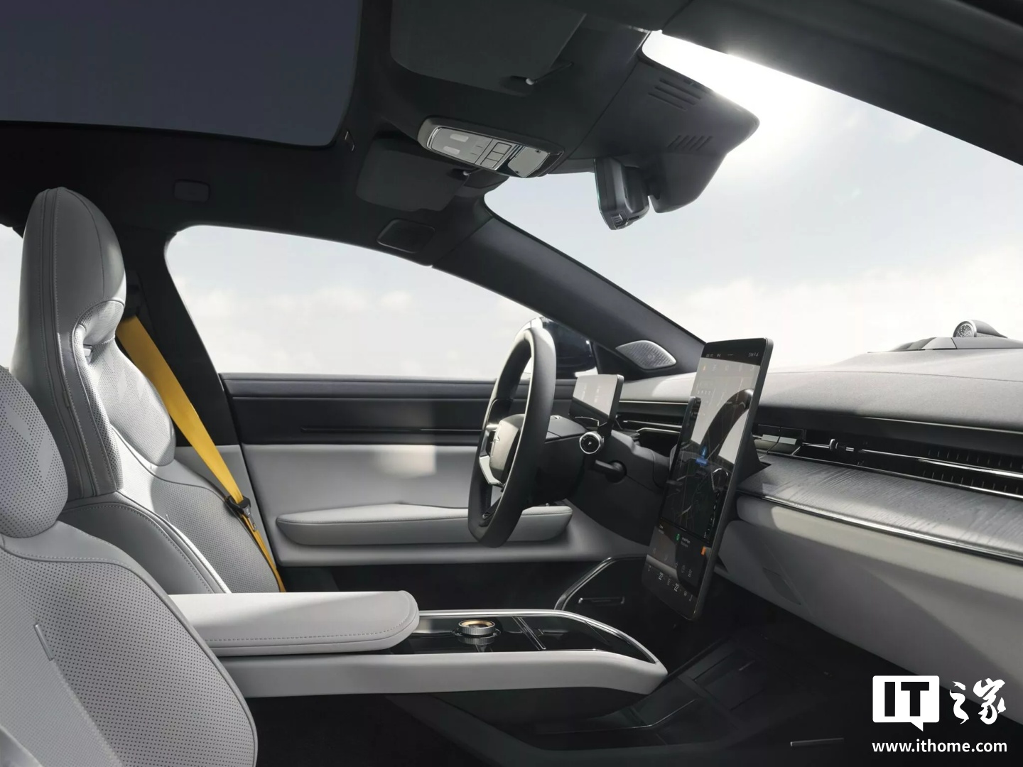 前排座椅由极星与 Recaro 联合设计,材质可选 MicroTech 仿麂皮或 Bridge of Weir 纳帕真皮,同时配备加热、通风与按摩功能。
