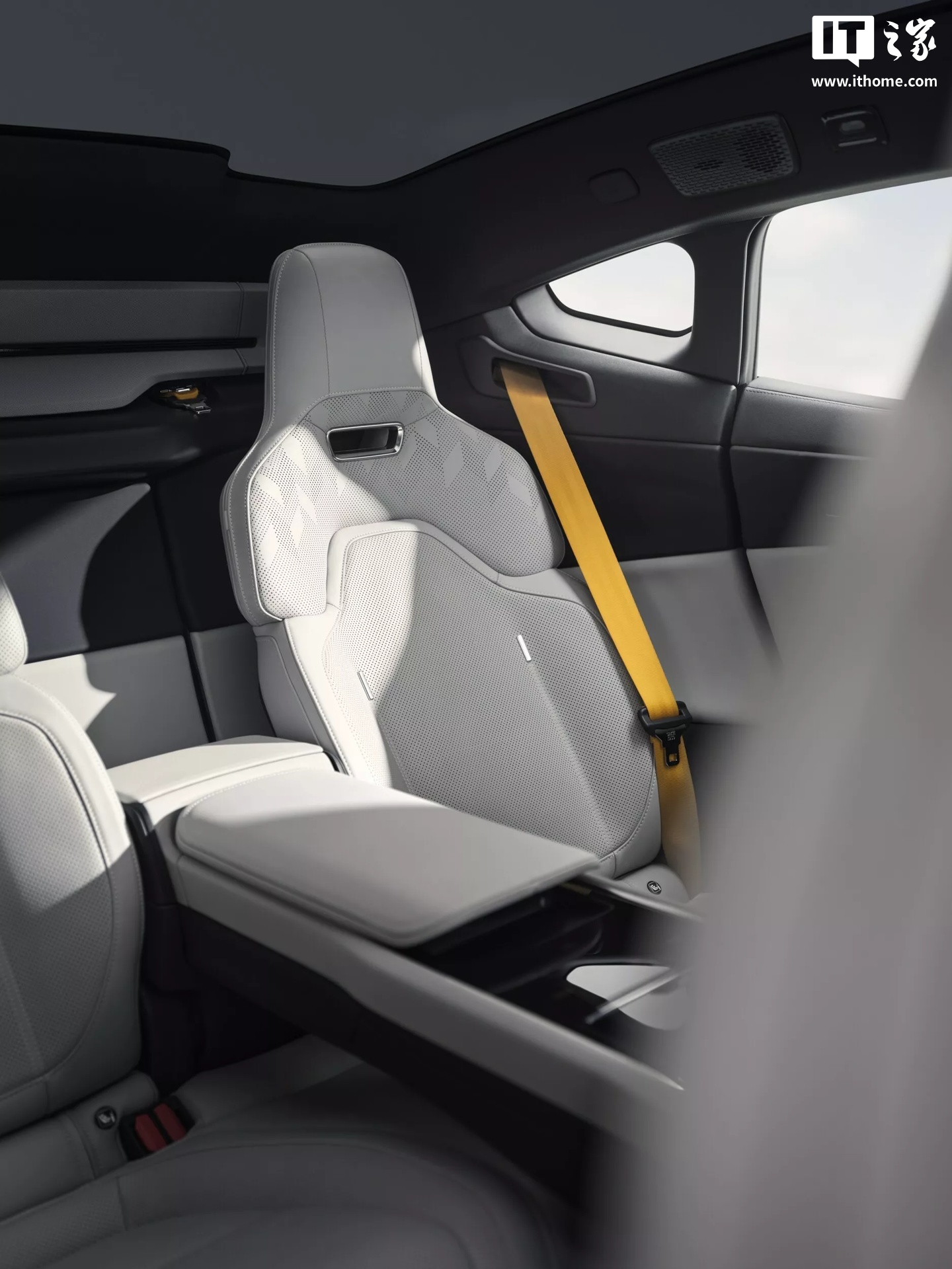 极星 5 采用四座布局,后排中央扶手放下后,可露出四区空调控制系统,以及后排座椅的加热、通风与按摩功能调节键。后排座椅支持靠背角度调节,此外,前排座椅后方还设计了“脚部凹槽”,极星官方表示,这一设计能为后排乘客提供更充裕的脚部空间,带来更自然的乘坐姿态。