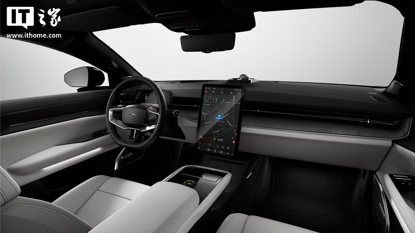 极星 5 的内饰采用极简设计风格,同时融入丰富科技配置:9 英寸全液晶仪表盘、9.5 英寸抬头显示系统(HUD),以及 14.5 英寸纵向布局的中控屏。其中中控屏搭载极星定制版 Android Automotive 操作系统,深度集成谷歌服务。