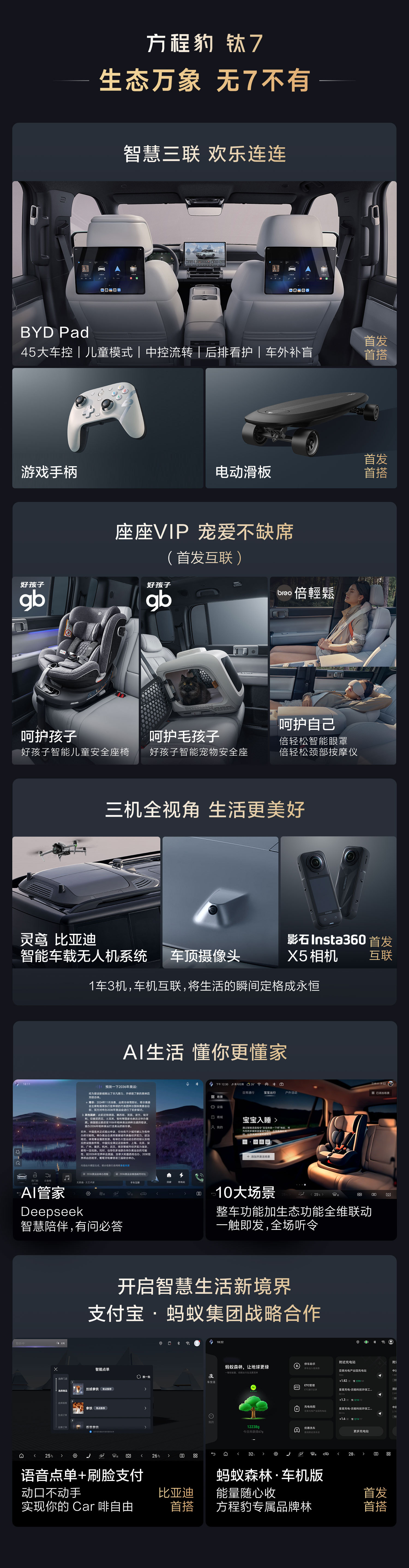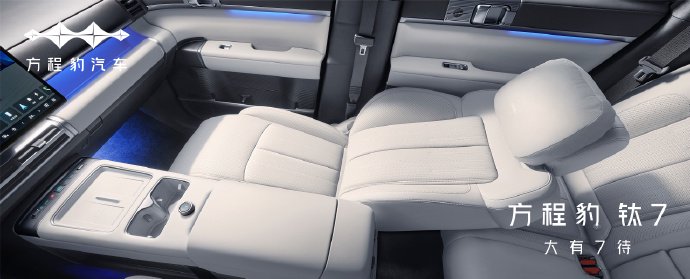在配置方面,钛 7 全系标配座椅通风 / 加热、前排座椅电动调节、W-HUD 抬头显示、双手机无线充电板等功能,并预留了前排座椅背后的生态接口。两驱高配车型还配备车载冷暖冰箱,悬架控制系统也进行了升级。顶配车型则提供了更高阶的音响系统和香氛系统。