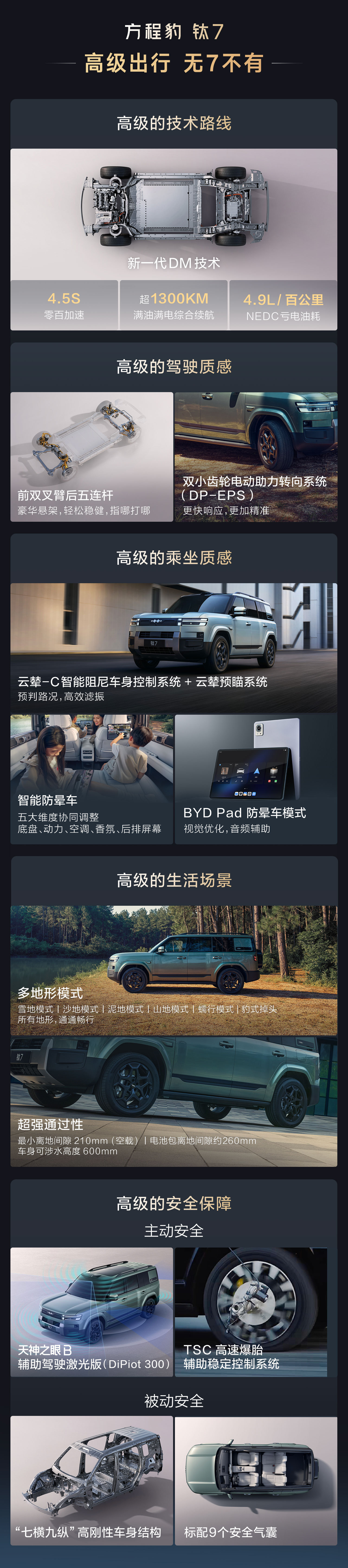 动力方面,钛 7 全系搭载 1.5T 插电混动系统,提供两驱和四驱版本。1.5T 发动机最大功率为 115 千瓦,两驱版配备单电机,最大功率 200 千瓦;四驱版配备前后双电机,最大功率分别为 160 千瓦和 200 千瓦。电池方面,两驱版车型提供 26.6 千瓦时和 35.6 千瓦时两种规格的电池组,四驱车型标配 35.6 千瓦时电池组。在 CLTC 工况下,纯电续航里程最低为 135 公里,最高可达 200 公里。此外,该车采用前双叉臂和后五连杆独立悬架,并具备高速爆胎辅助功能。