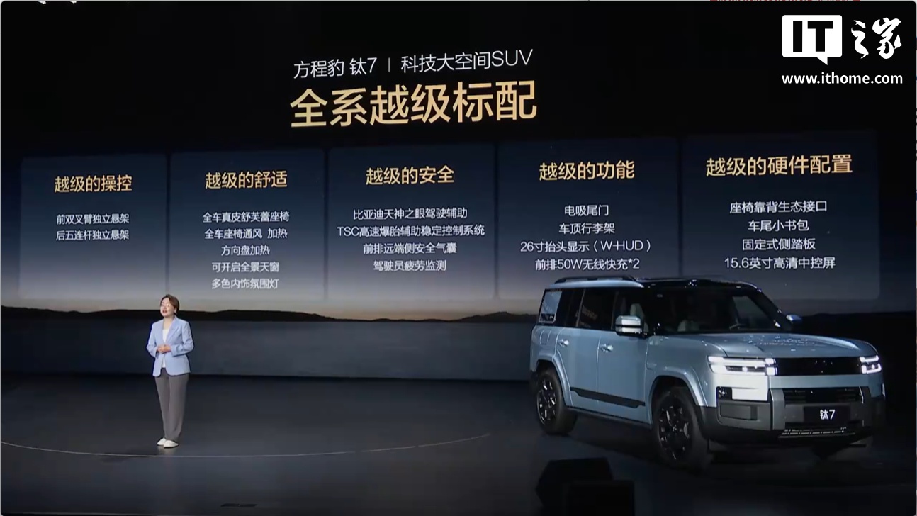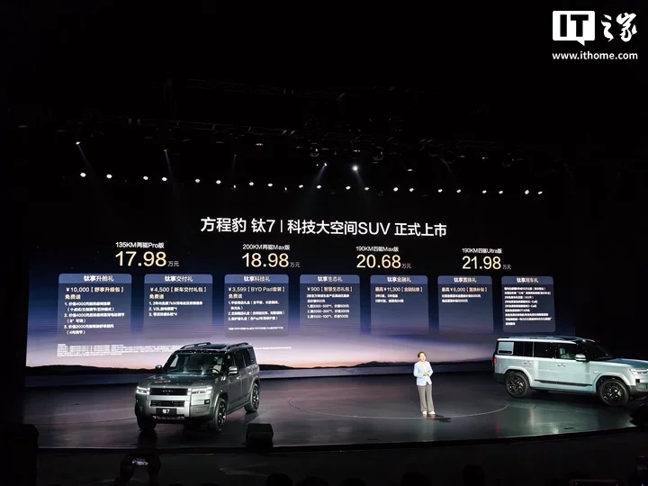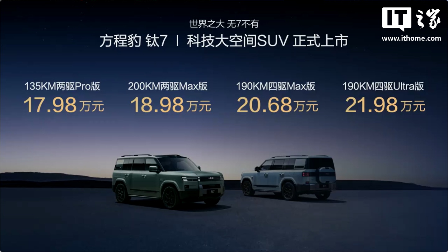 IT之家 9 月 9 日消息,今晚比亚迪方程豹品牌旗下钛 7 正式上市并开启交付,共推出四款车型,售价 17.98 万~21.98 万元。