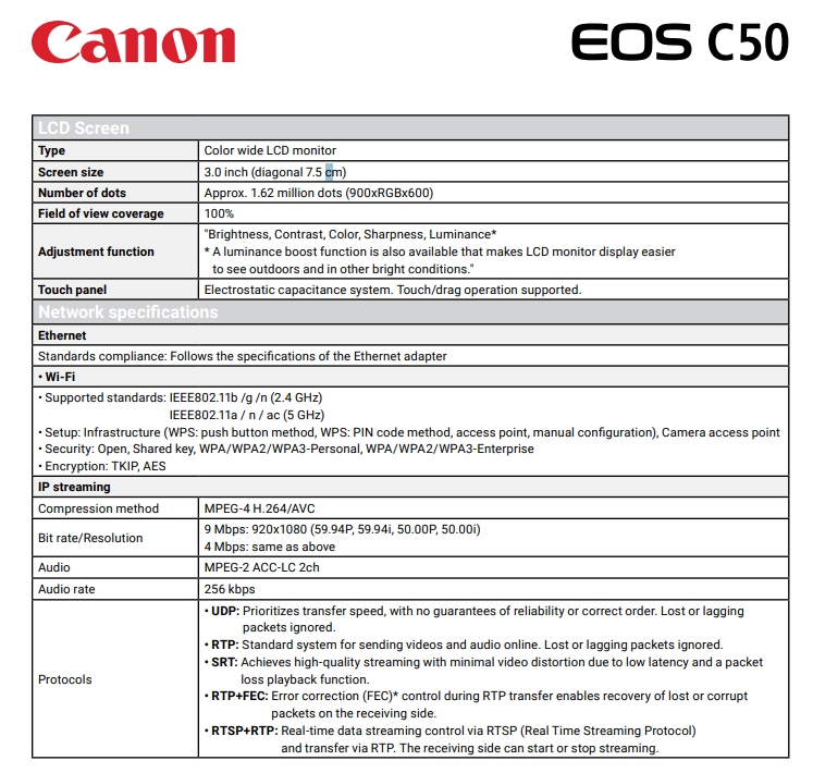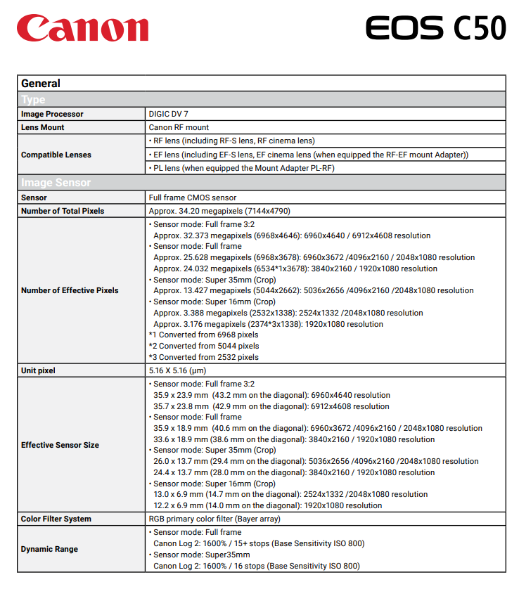 EOS C50 采用全新设计的 3420 万像素(7144x4790)全画幅 CMOS 图像传感器,支持 15 挡动态范围,搭载 DIGIC DV 7 处理器。