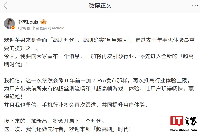 IT之家 9 月 10 日消息,一加中国区总裁李杰今日发文欢迎苹果来到全面「高刷时代」。他表示,高刷确实“但用难回”,是过去十年手机体验最重要的提升之一。