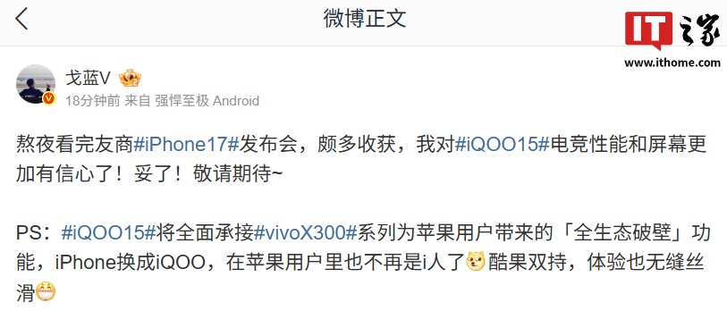 IT之家 9 月 10 日消息,iQOO 产品经理 @戈蓝V 今日发文称熬夜看完友商 iPhone17 发布会,颇多收获,对 iQOO15 电竞性能和屏幕更加有信心了。他还直言:“妥了!敬请期待~”