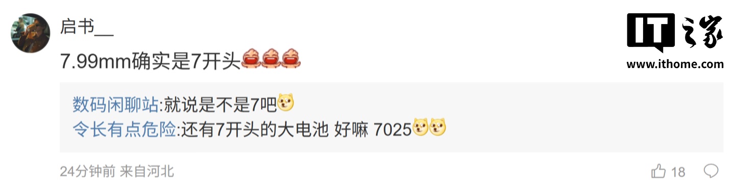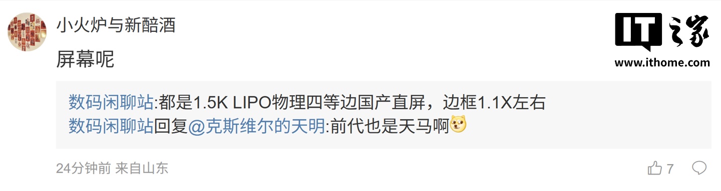 后续有用户在评论区询问:“屏幕呢”,博主回复道:“都是 1.5K LIPO 物理四等边国产直屏,边框 1.1X 左右”;另一名用户则表示:“7.99mm 确实是 7 开头”,博主则回复道:“就说是不是 7 吧
