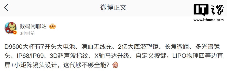值得注意的是,这名博主曾在上月爆料,某厂的天玑 9500 芯片大杯手机将拥有 7 开头大电池、满血无线充等配置,配备 2 亿像素大底潜望镜、长焦微距、多光谱镜头,拥有 3D 超声波指纹、升级 X 轴马达,预计为 OPPO Find X9 Pro。