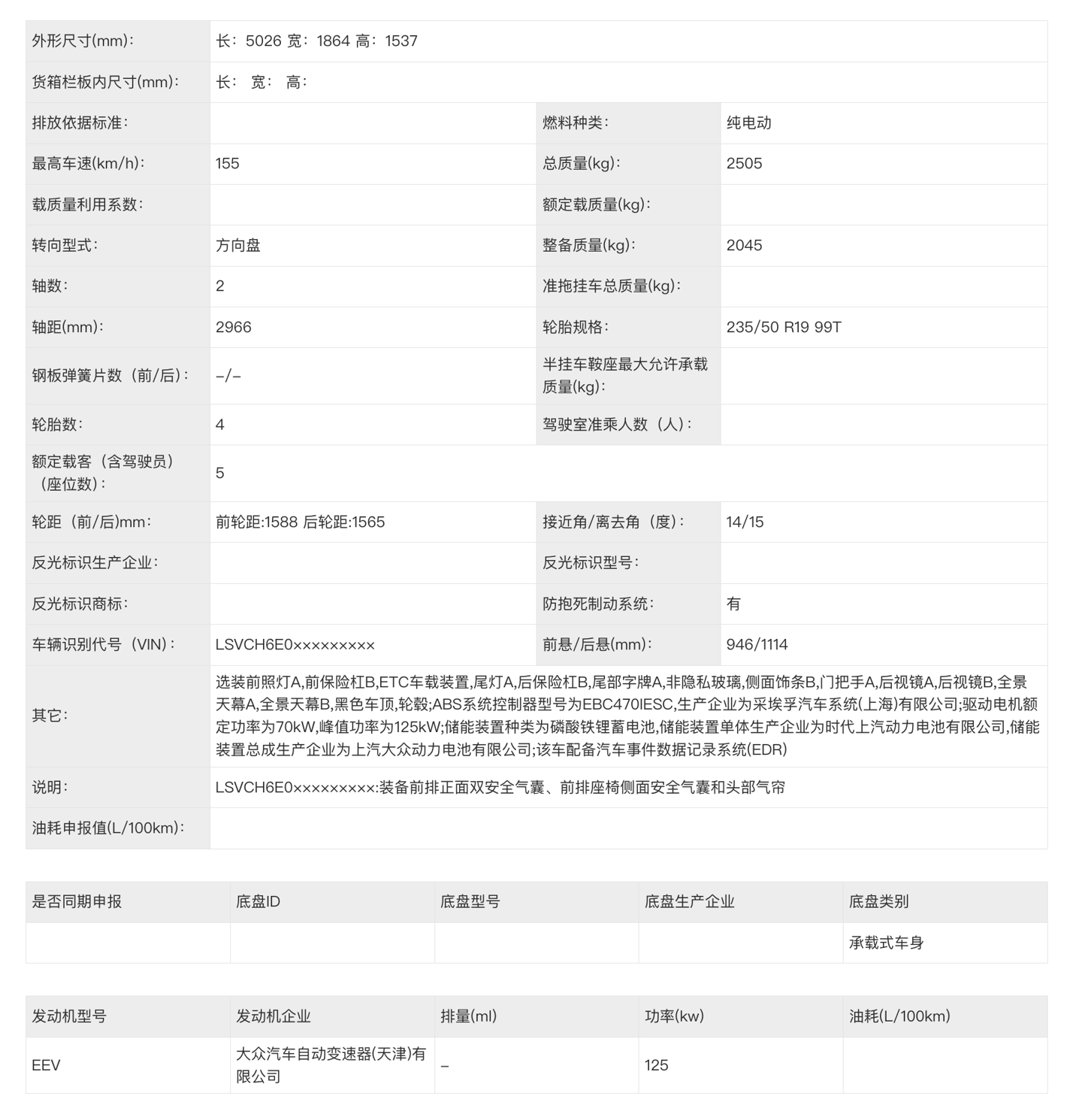 这款新车的尺寸颇为“傲人”,长宽高分别为 5026/1864/1537mm,轴距 2966mm,总质量 2505kg。动力方面,新车搭载一台功率 125kW 的电动机以及时代上汽动力电池有限公司的磷酸铁锂蓄电池,最高车速 155km/h。