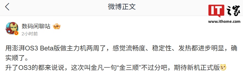 IT之家 9 月 11 日消息,博主 @数码闲聊站 今日发文称,用澎湃 OS3 Beta 版做主力机两周了,感觉流畅度、稳定性、发热都进步明显,确实顺了。博主还表示,这次叫金凡一句“金三顺”不过分吧,期待新机正式版。