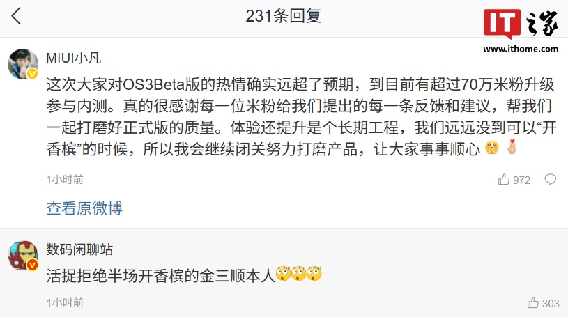 这次大家对 OS3Beta 版的热情确实远超了预期,到目前有超过 70 万米粉升级参与内测。真的很感谢每一位米粉给我们提出的每一条反馈和建议,帮我们一起打磨好正式版的质量。体验还提升是个长期工程,我们远远没到可以“开香槟”的时候,所以我会继续闭关努力打磨产品,让大家事事顺心。