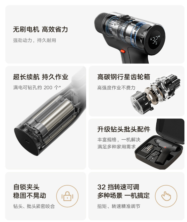 此外,这款电钻采用了自锁夹头、高碳钢行星齿轮箱、升级钻头批头配件,支持 32 挡转速可调,提供丰富规格,满足多种家用需求。