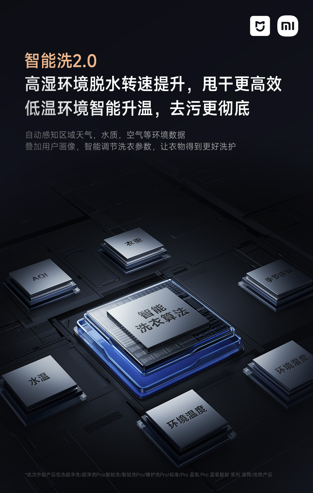 智能洗 2.0,自动感知区域天气、水质、空气等环境数据,叠加用户画像,智能调节洗衣参数