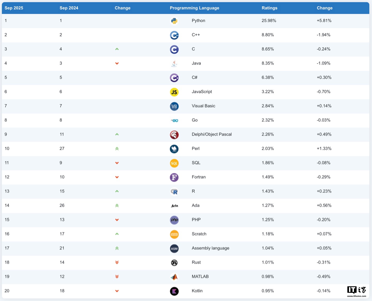 IT之家 9 月 11 日消息,TIOBE 编程社区指数是一个衡量编程语言受欢迎程度的指标,评判的依据来自世界范围内的工程师、课程、供应商及搜索引擎,目前 TIOBE 官网公布了 2025 年 9 月的编程语言排行榜,IT之家整理如下: