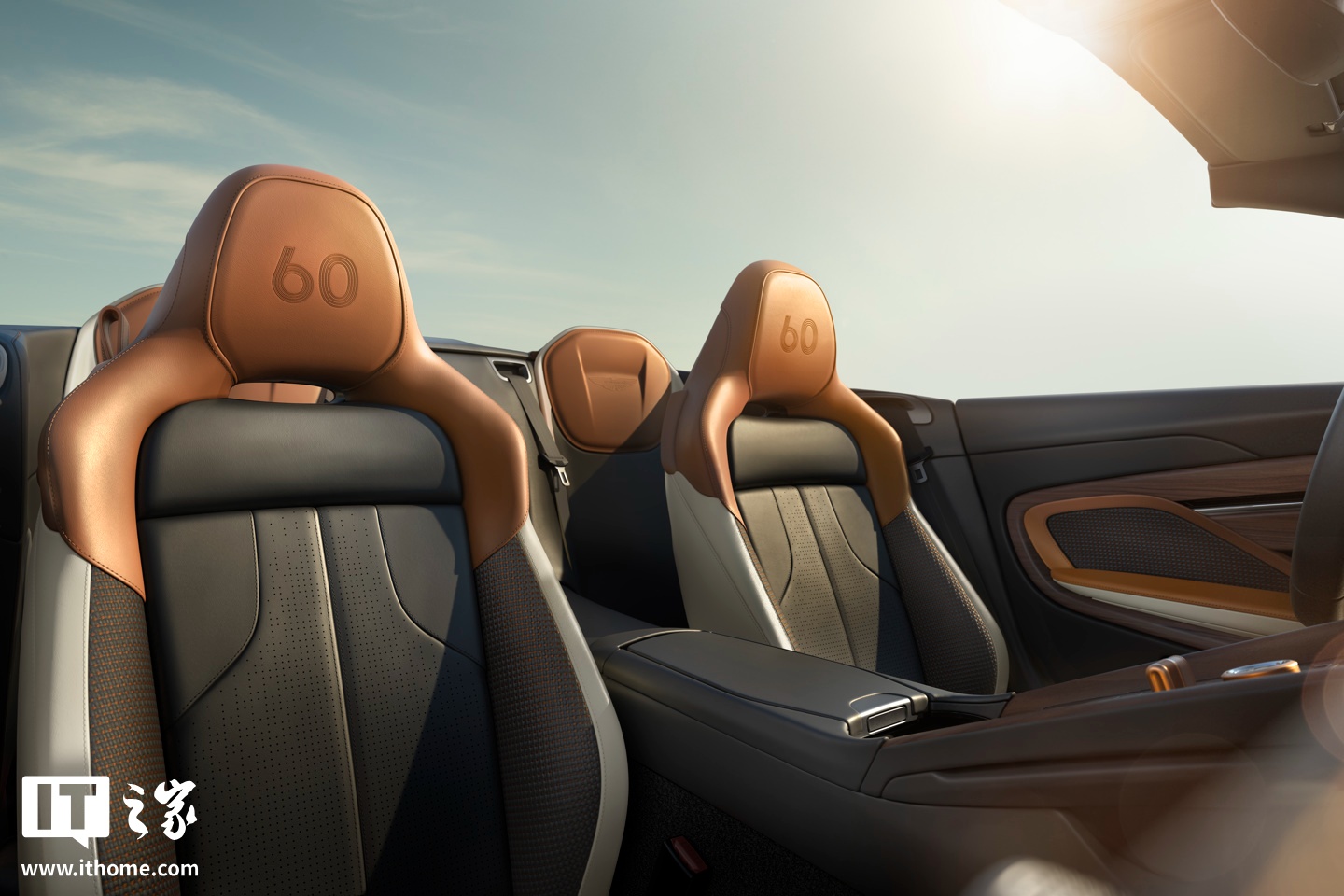 进入车内,两款纪念版车型的内饰采用专属的三色调配色方案 —— 经典马鞍棕、象牙白与编织皮革相结合,营造出奢华而独特的内饰氛围。中控面板、车门内饰板以及座椅后面板等位置采用深色胡桃木饰板,电子换挡杆与旋钮部分则使用古铜金材质,头枕处有专属的 60 周年纪念刺绣。