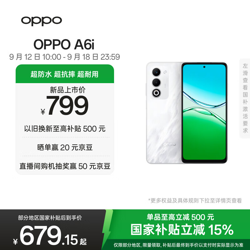 IT之家 9 月 12 日消息,OPPO A6i 手机现已在京东开启首销,该机搭载天玑 6300 处理器,首发价 799 元起,叠加国补后 679.15 元起,IT之家整理价格信息如下: