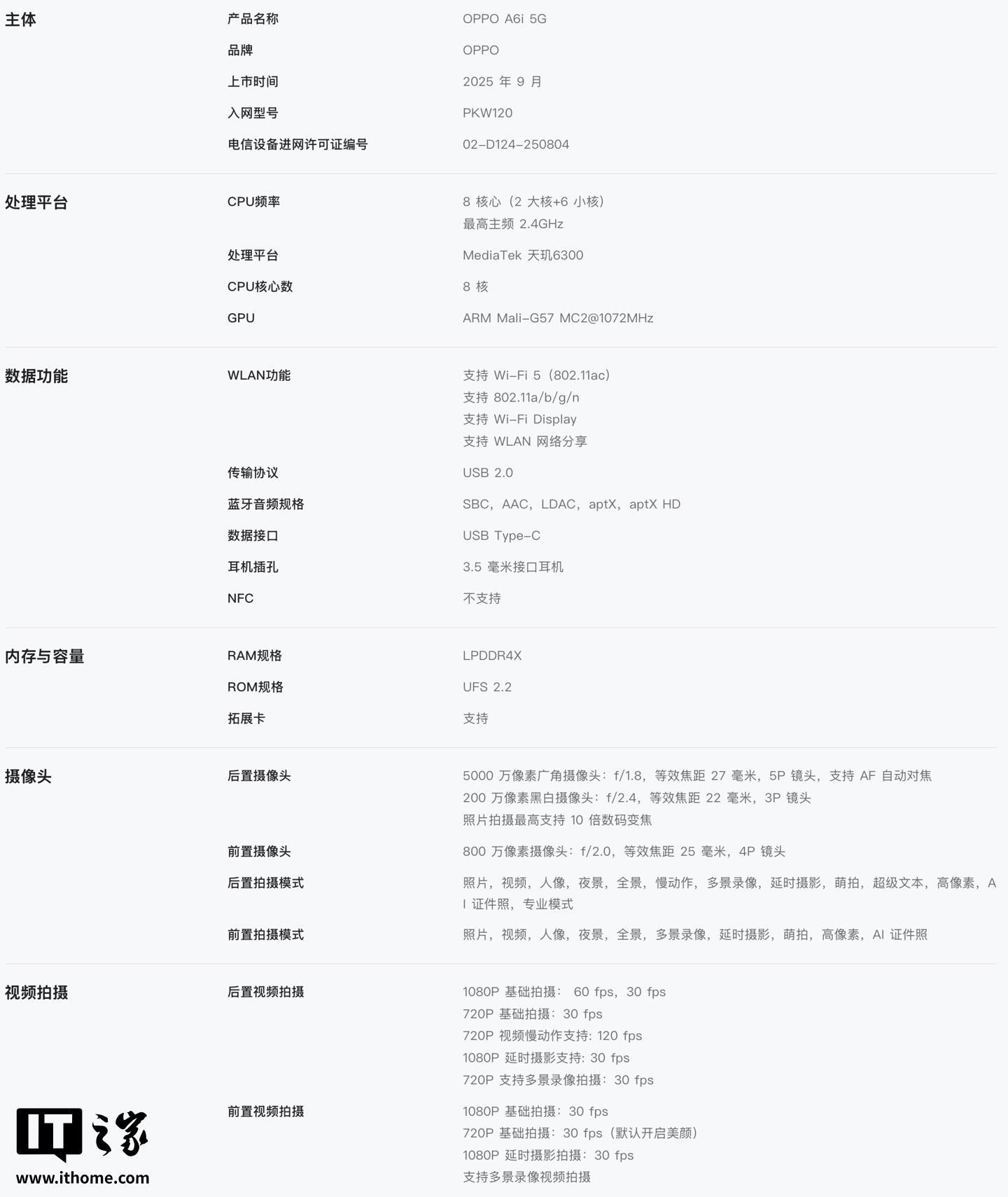 规格方面,该机搭载联发科天玑 6300 处理器,匹配 6/8GB LPDDR4X RAM 和 128/256GB UFS 2.2 存储,内置 6000 毫安时电池,支持 45W 有线充电。