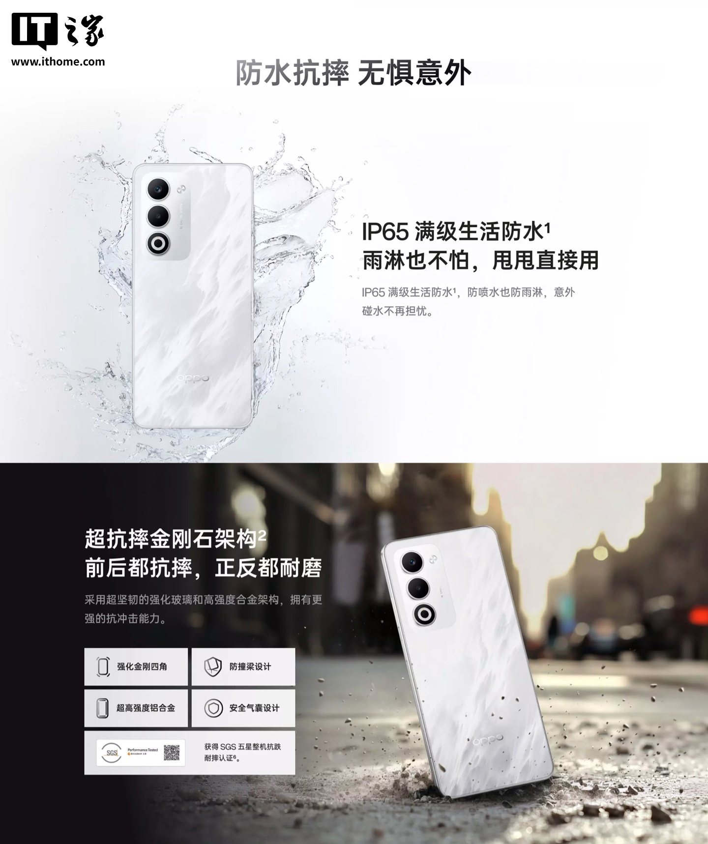 官方强调,该机采用超抗摔金刚石架构,拥有 IP65 认证。手机同时提供 300% 超级音量、湿手触控、户外模式等功能。