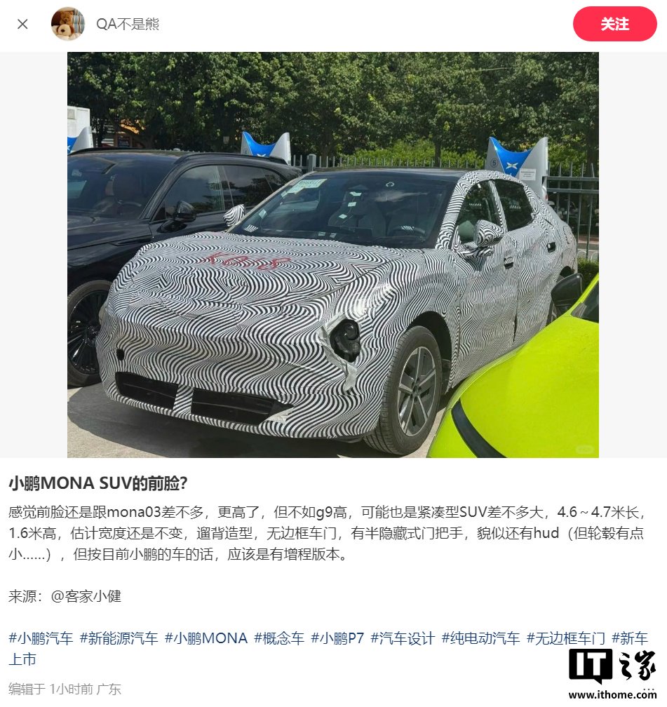 IT之家 9 月 12 日消息,小鹏 MONA 系列新款车型曝光,网上日前流传出两张伪装车谍照,预计是 MONA 系列首款 SUV 车型。