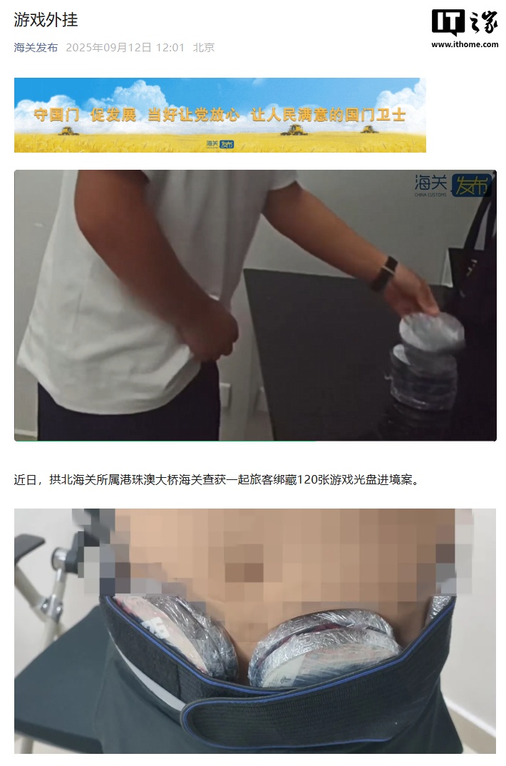IT之家 9 月 12 日消息,据“海关发布”微信公众号今日更新,拱北海关所属港珠澳大桥海关查获一起旅客私藏游戏光碟入境案。