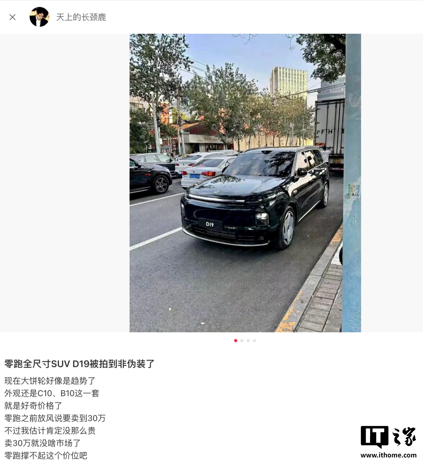 IT之家 9 月 12 日消息,今天晚间,网上流出了多张零跑 D19 的无伪装实车谍照。根据产品定位,这款车将是零跑汽车最大、最高端的 SUV,属于主打豪华的 D 系列。