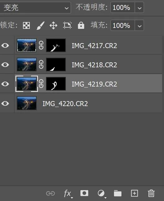 3.这时候,每张照片都是一个图层,我们可以把图层的混合模式改成“变亮”,并配合蒙版工具修补各个区域的车轨。
