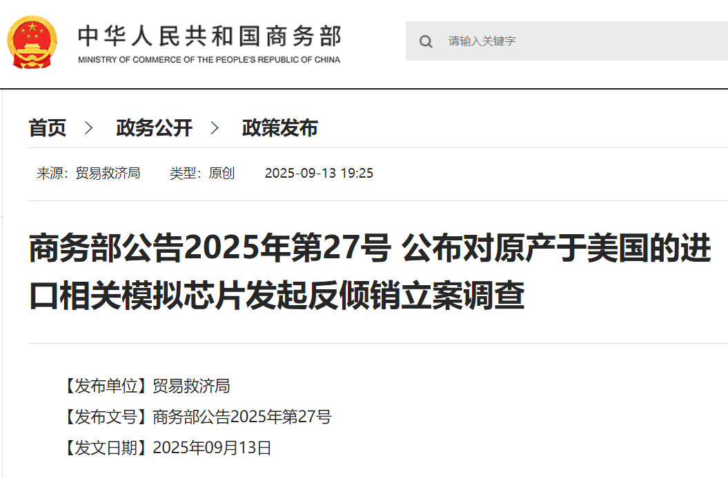 IT之家 9 月 13 日消息,商务部今日发布 2025 年第 27 号公告,对原产于美国的进口相关模拟芯片发起反倾销立案调查。IT之家附公告全文: