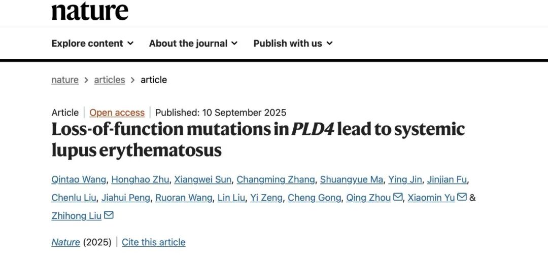2025 年 9 月 10 日,由浙江大学良渚实验室、东部战区总医院国家肾脏疾病临床医学研究中心和浙江大学生命科学研究院等单位合作完成一项题为“Loss-of-function mutations in PLD4 lead to systemic lupus erythematosus”的研究论文在 Nature 发表。该研究首次证实人类 PLD4 缺陷可导致 SLE 并阐明了其致病机制,为 SLE 的精准诊疗提供了重要理论依据。