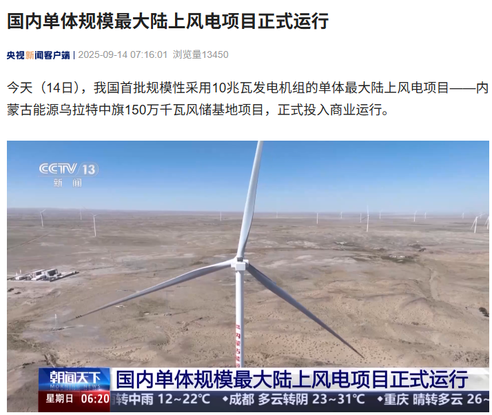 IT之家 9 月 14 日消息,据央视新闻报道,今天,我国首批规模性采用 10 兆瓦发电机组的单体最大陆上风电项目 —— 内蒙古能源乌拉特中旗 150 万千瓦风储基地项目,正式投入商业运行。